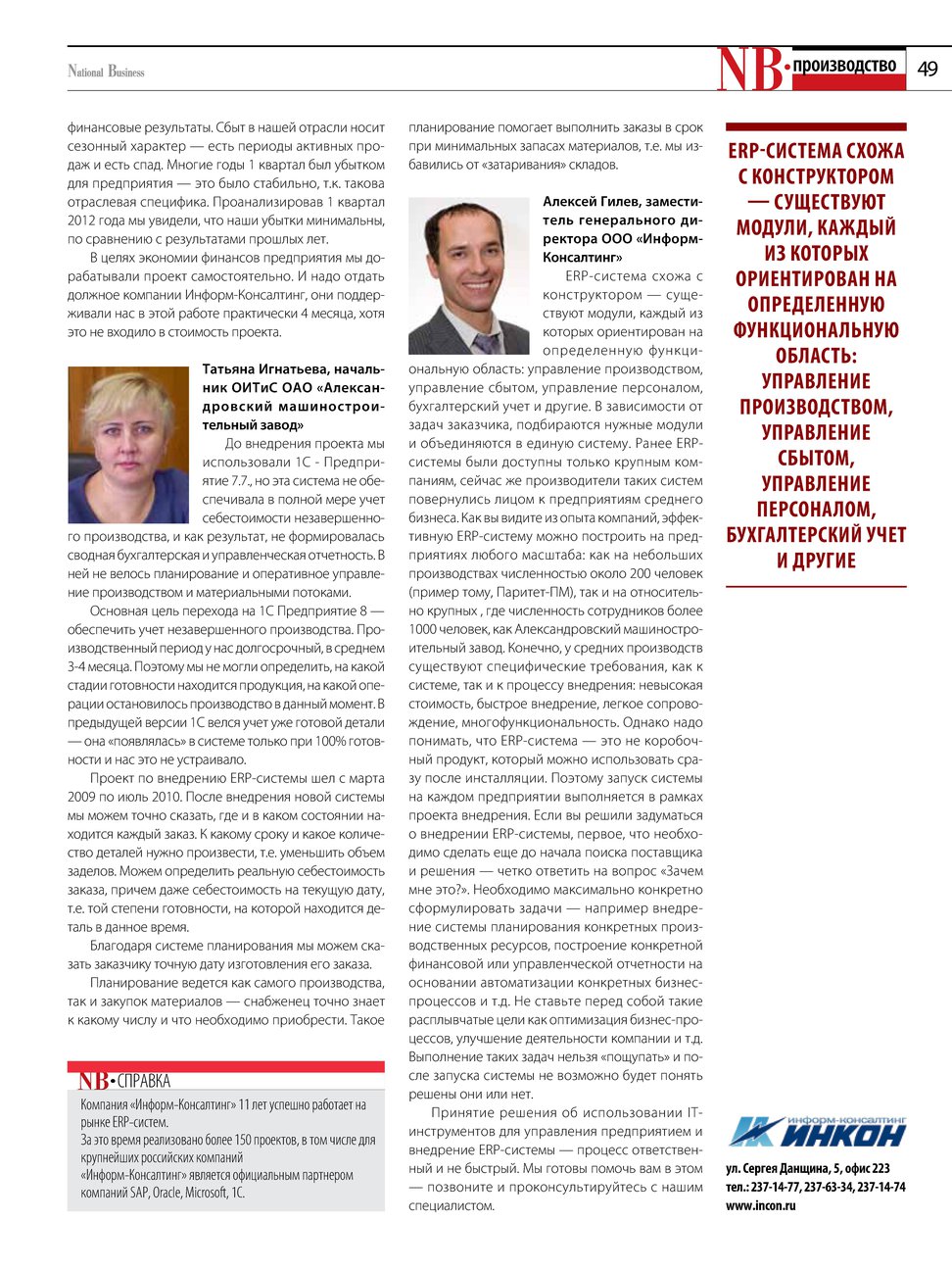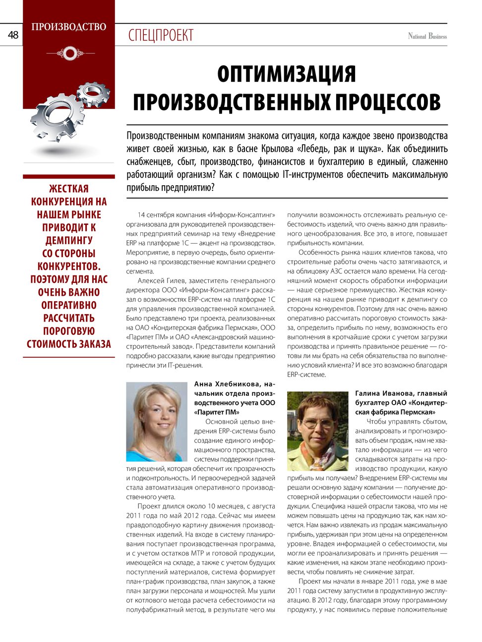 Мнения представителей предприятий о проектах внедрения ERP-систем опубликованы в рубрике Спецпроекты журнала National Business от 26.09.2012.
