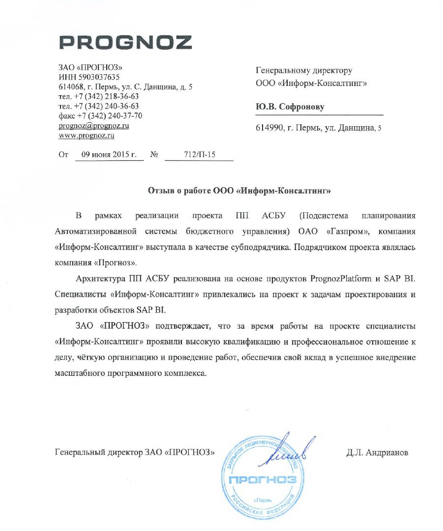 Компанией «Информ-Консалтинг» получен отзыв по итогам проекта внедрения ПП АСБУ (Подсистемы планирования Автоматизированной системы бюджетного управления) ОАО «Газпром».