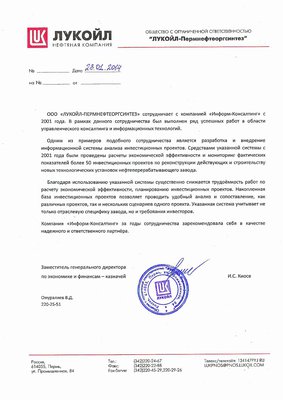 Отзыв заместителя генерального директора по экономике и финансам ООО "ЛУКОЙЛ-Пермнефтеоргсинтез" И.С.Киосе о сотрудничестве в области управленческого консалтинга и инфрмационных технологий.