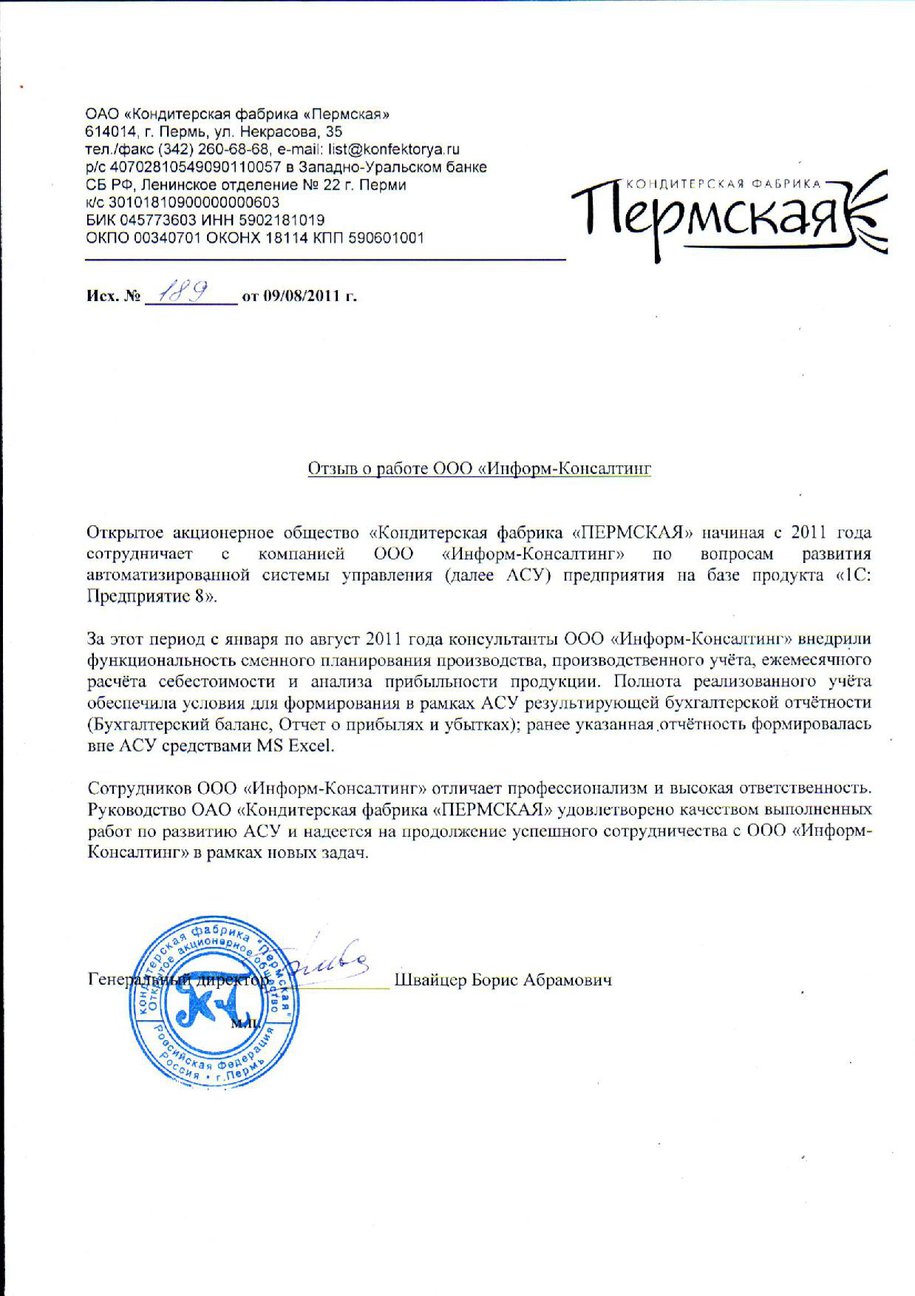 Отзыв генерального директора ОАО "Кондитерская фабрика "Пермская" Б.А.Швайцера о проекте развития автоматизированной системы управления предприятием на платформе "1С: Предприятие".
