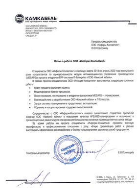 Отзыв генерального директора ООО "Камский кабель" В.В.Пономарёва о проекте внедрения APS/MES-системы на платформе "IT-Enterprise".