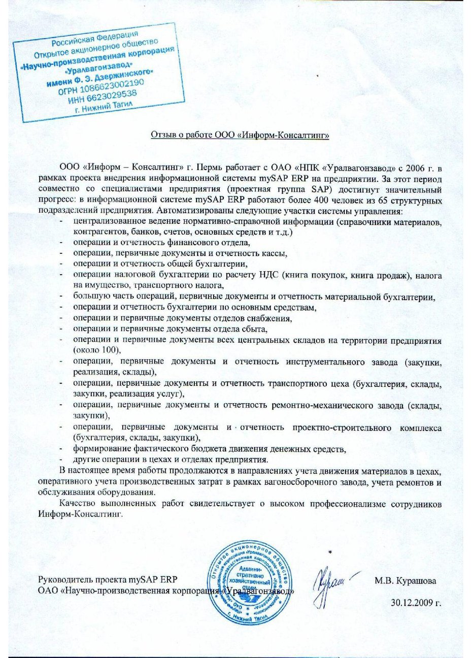 Отзыв руководителя проекта mySAP ERP ОАО "НПК "Уралвагонзавод" М.В.Курашовой о проекте развития SAP ERP.